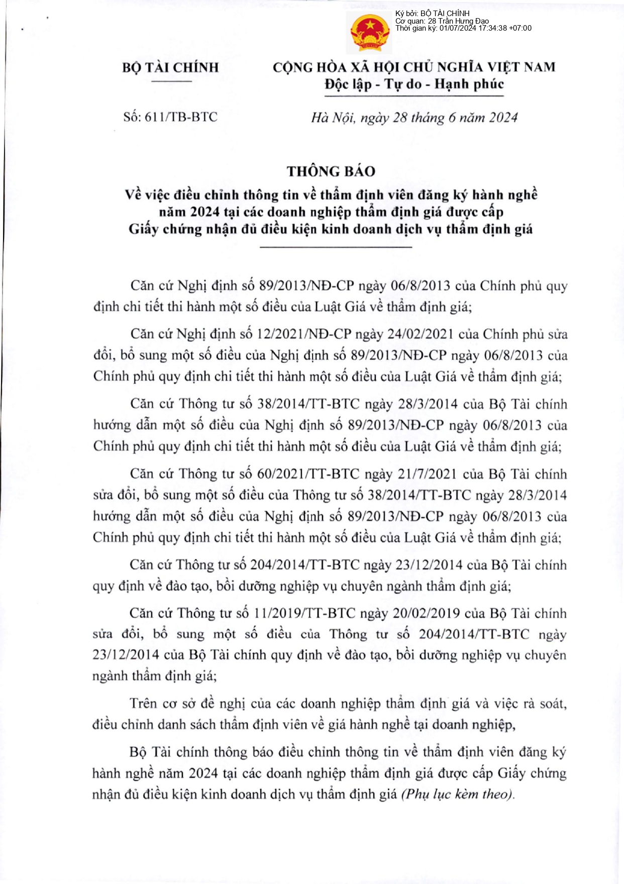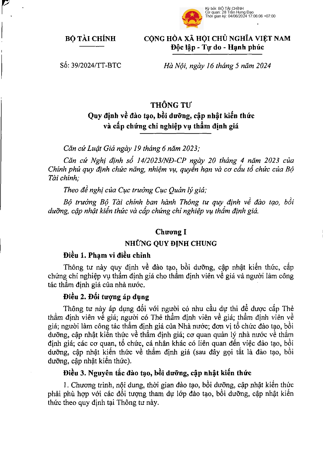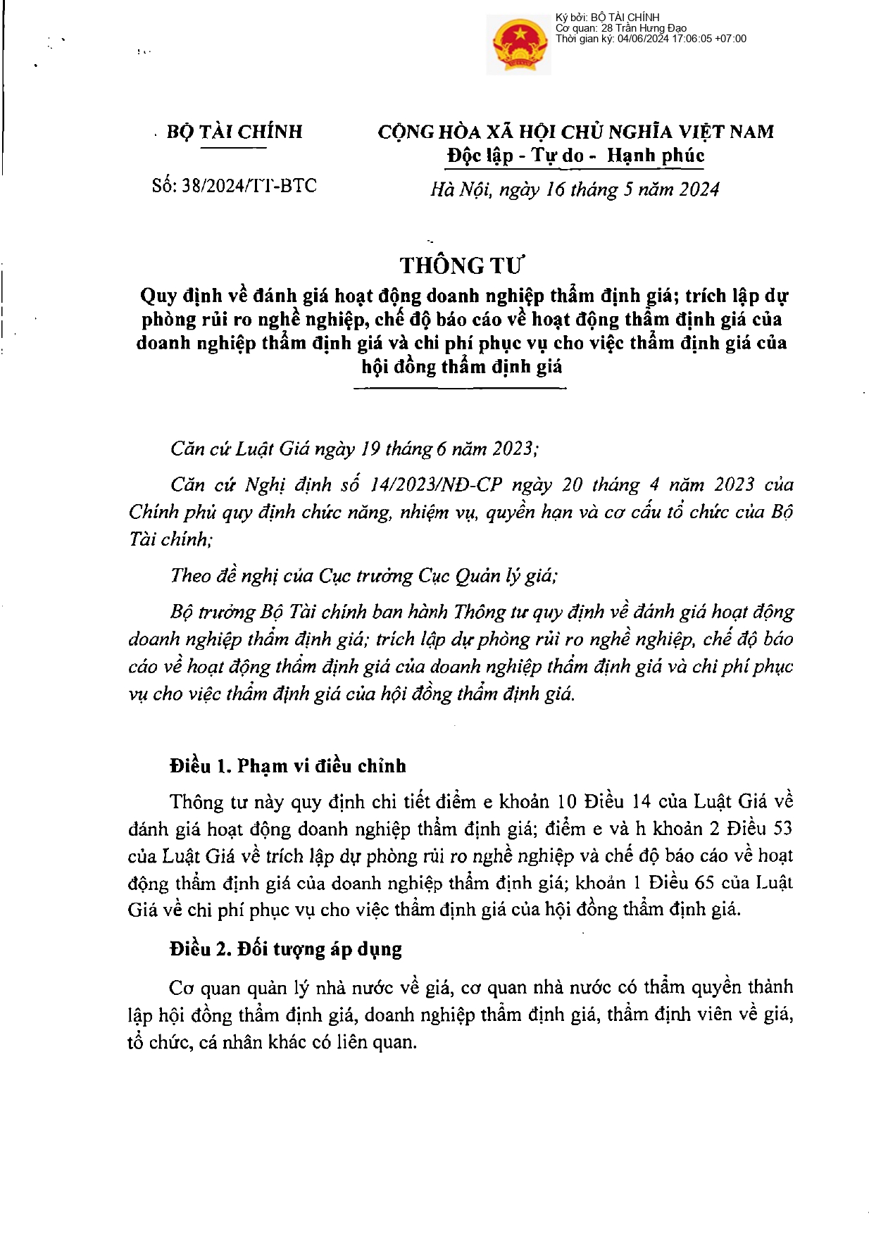 Ngày 16/05/2024, Bộ trưởng Bộ Tài chính ban hành Thông tư 38/2024/TT-BTC quy định về đánh giá hoạt động doanh nghiệp thẩm định giá; trích lập dự phòng rủi ro nghề nghiệp, chế độ báo cáo về hoạt động thẩm định giá của doanh nghiệp thẩm định giá và chi phí phục vụ cho việc…