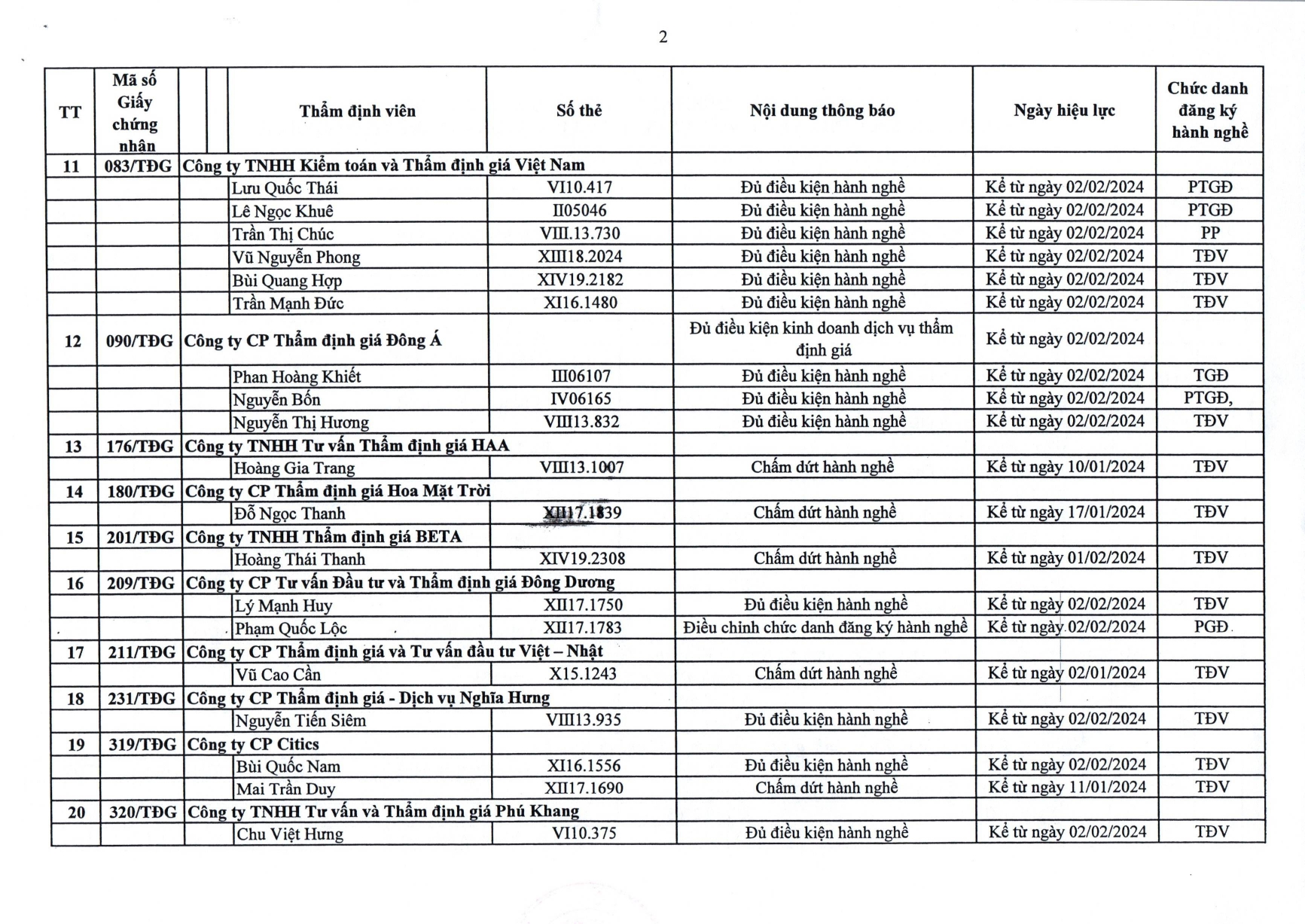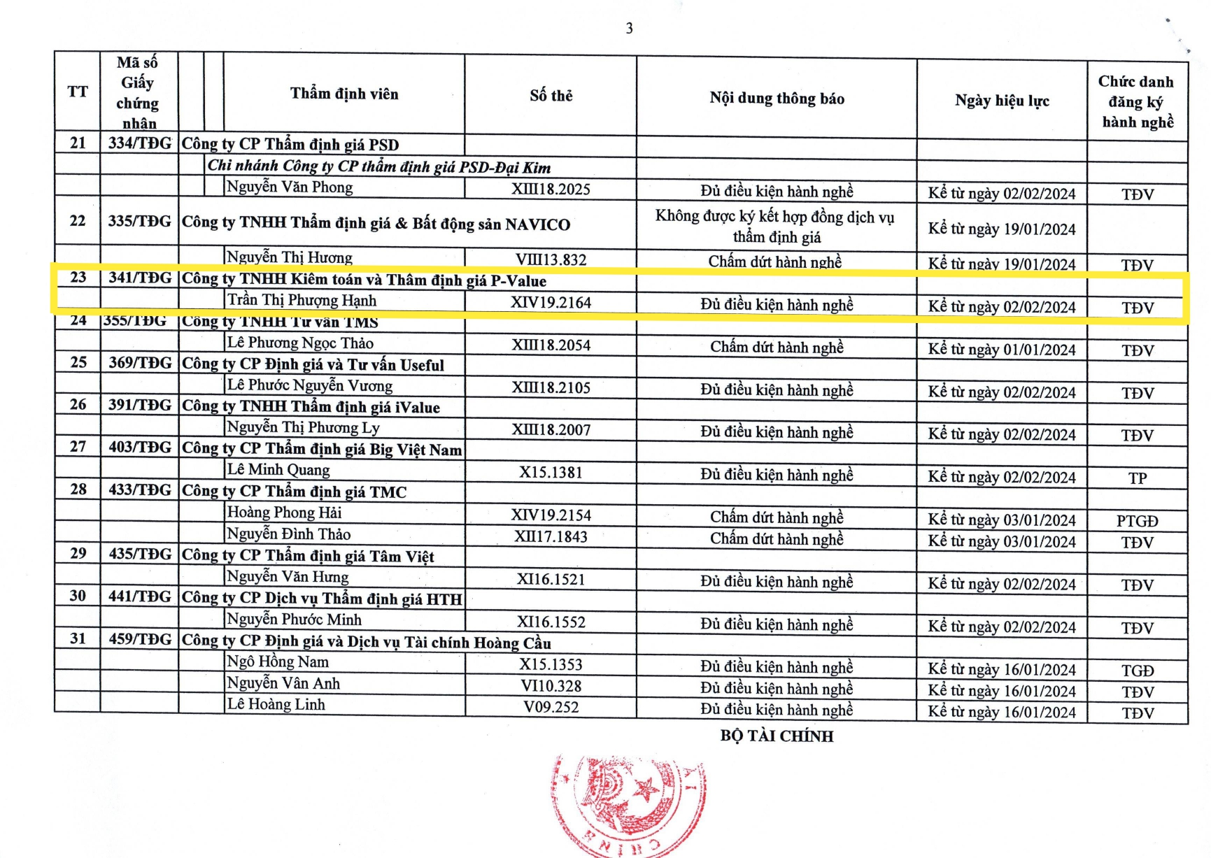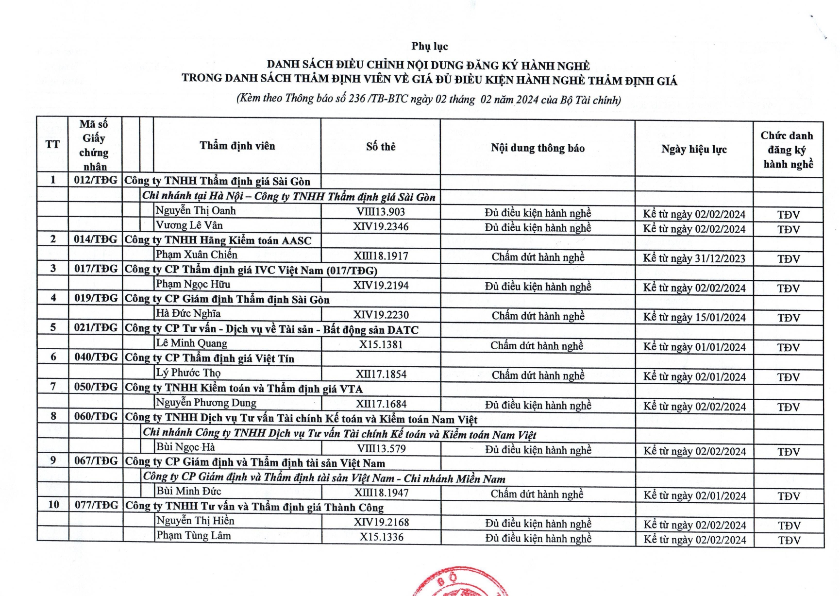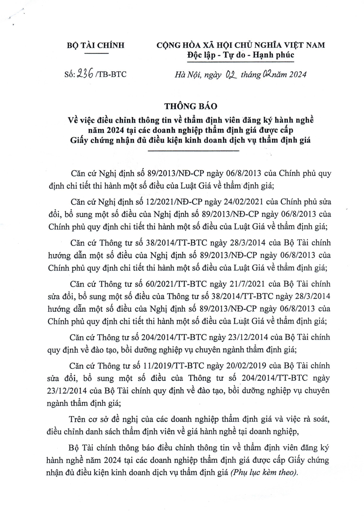 Thông báo số 236/TB-BTC về việc điều chỉnh thông tin về Thẩm định viên đăng ký hành nghề năm 2024