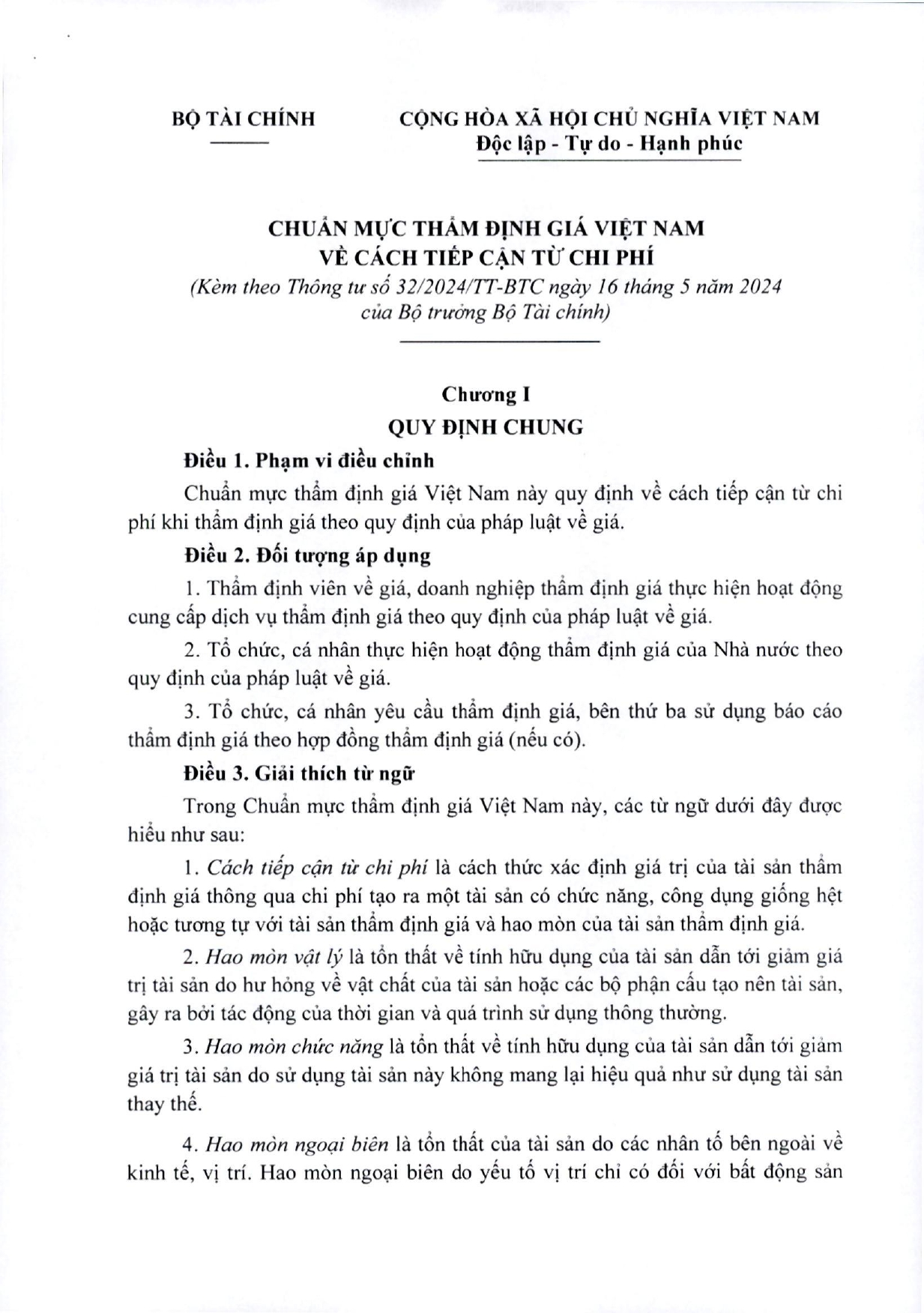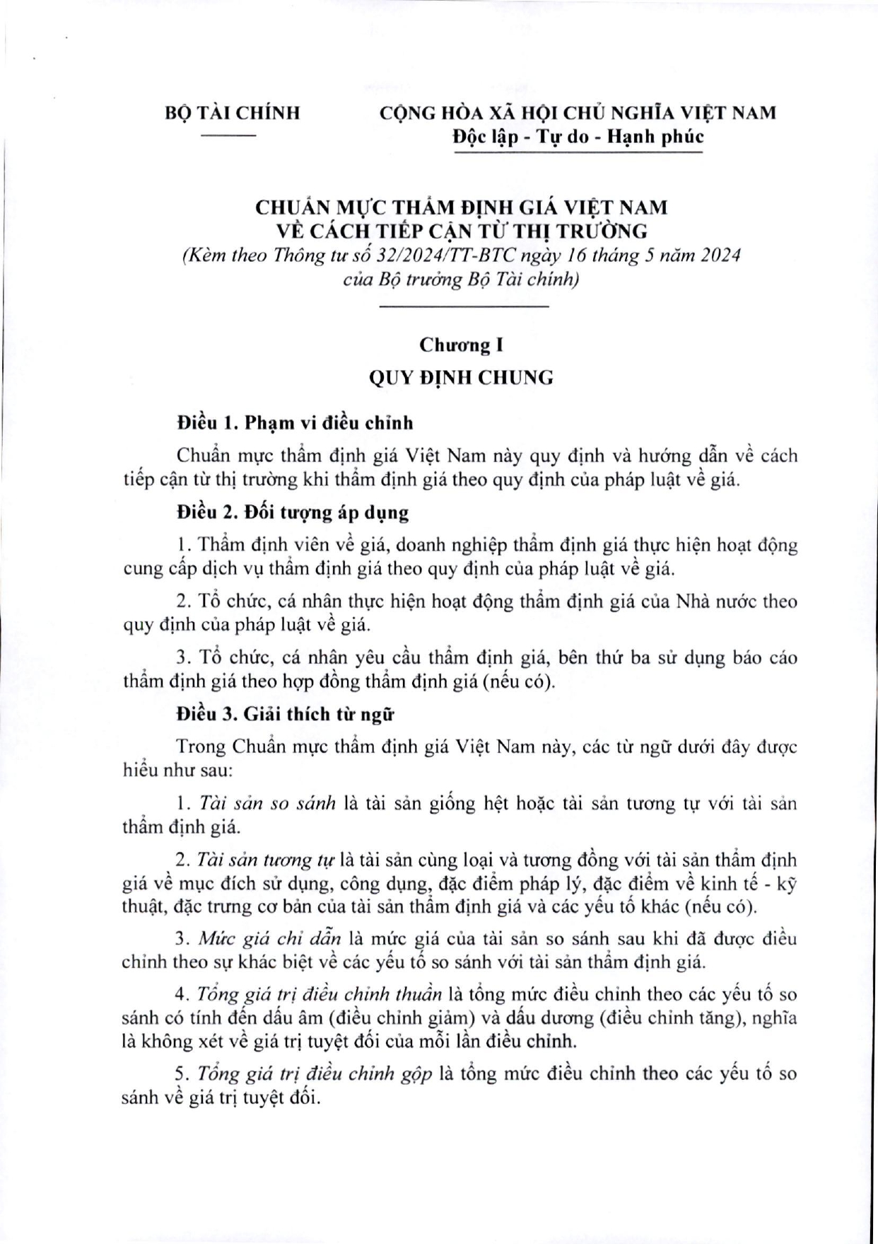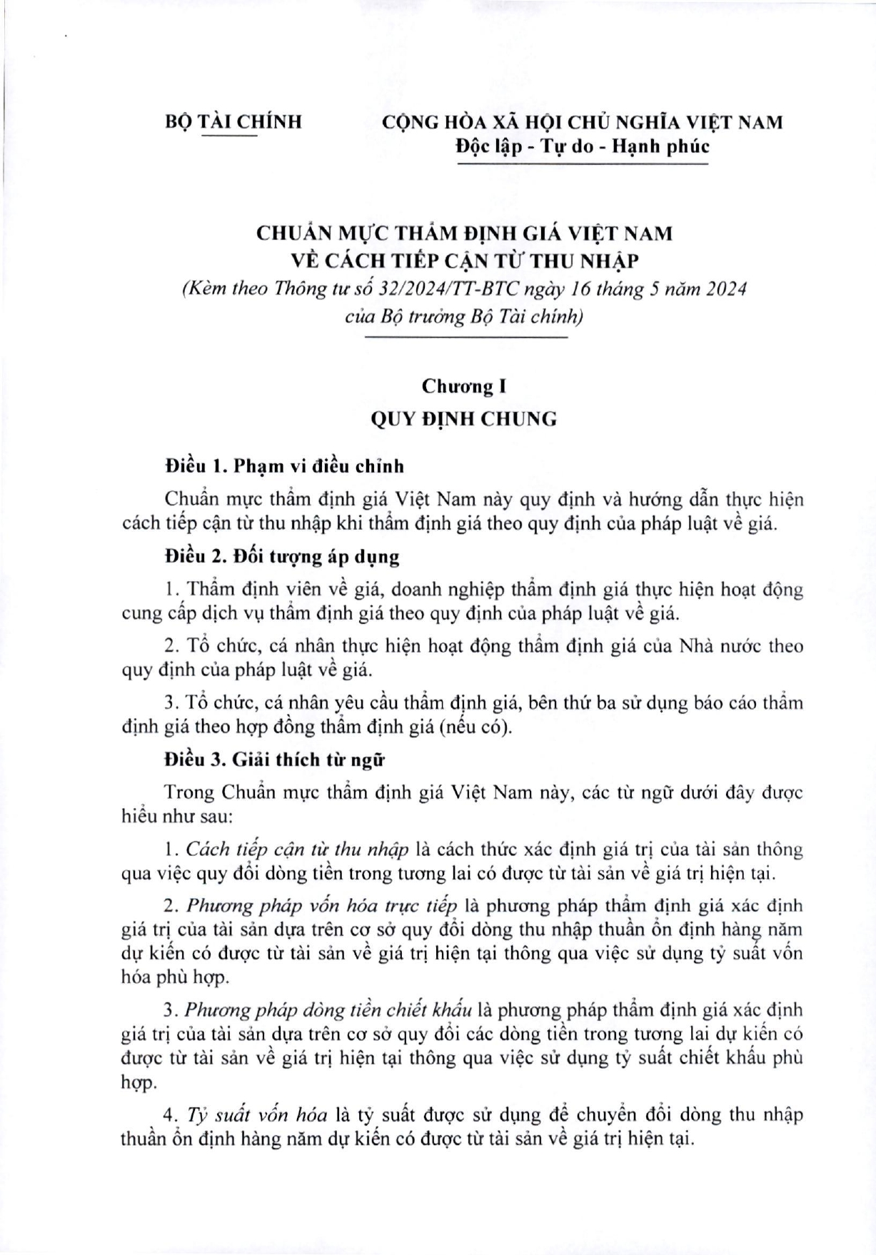 Ngày 16/05/2024 Bộ trưởng Bộ Tài chính ban hành Thông tư 32/2024/TT-BTC ban hành các chuẩn mực thẩm định giá Việt Nam về cách tiếp cận từ thị trường, cách tiếp cận từ chi phí, cách tiếp cận từ thu nhập.