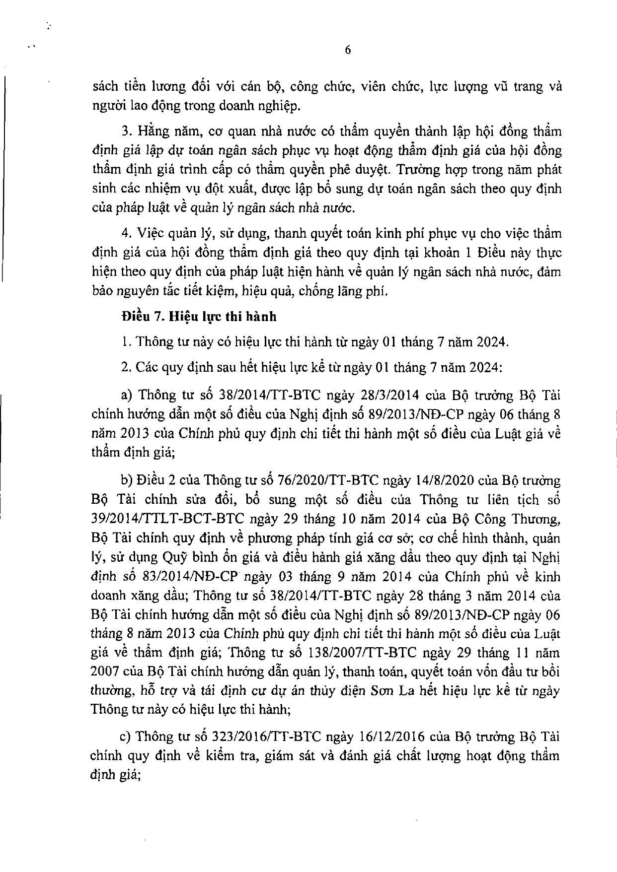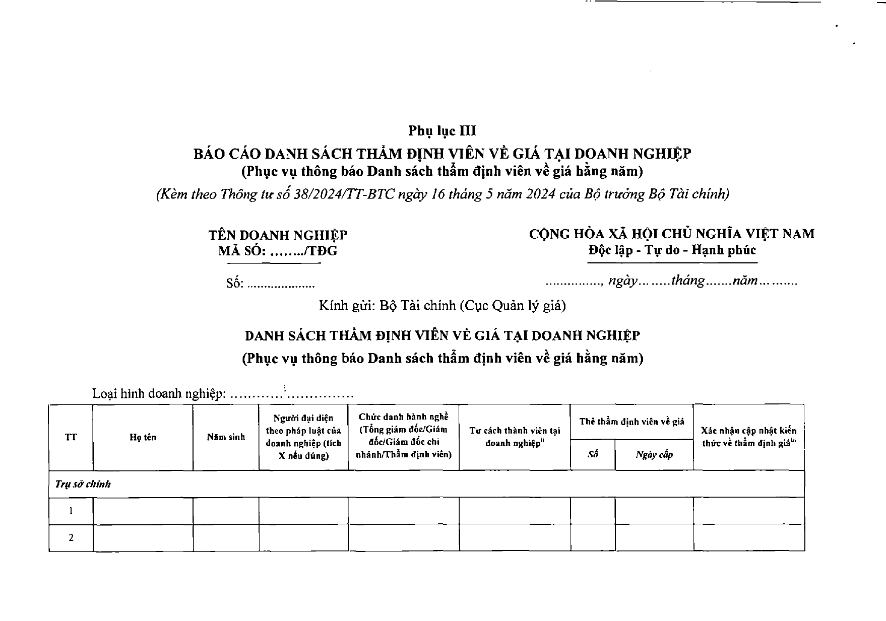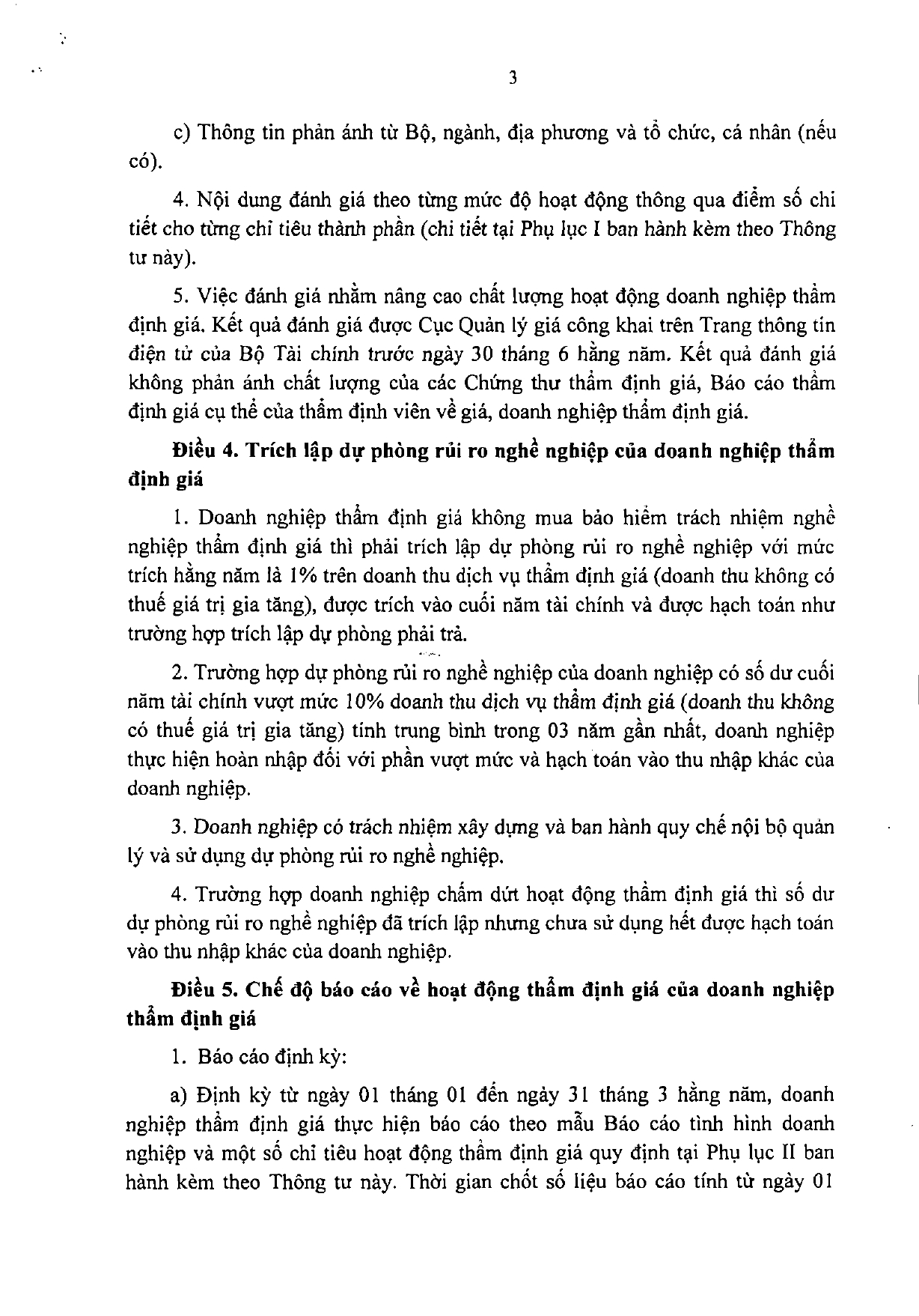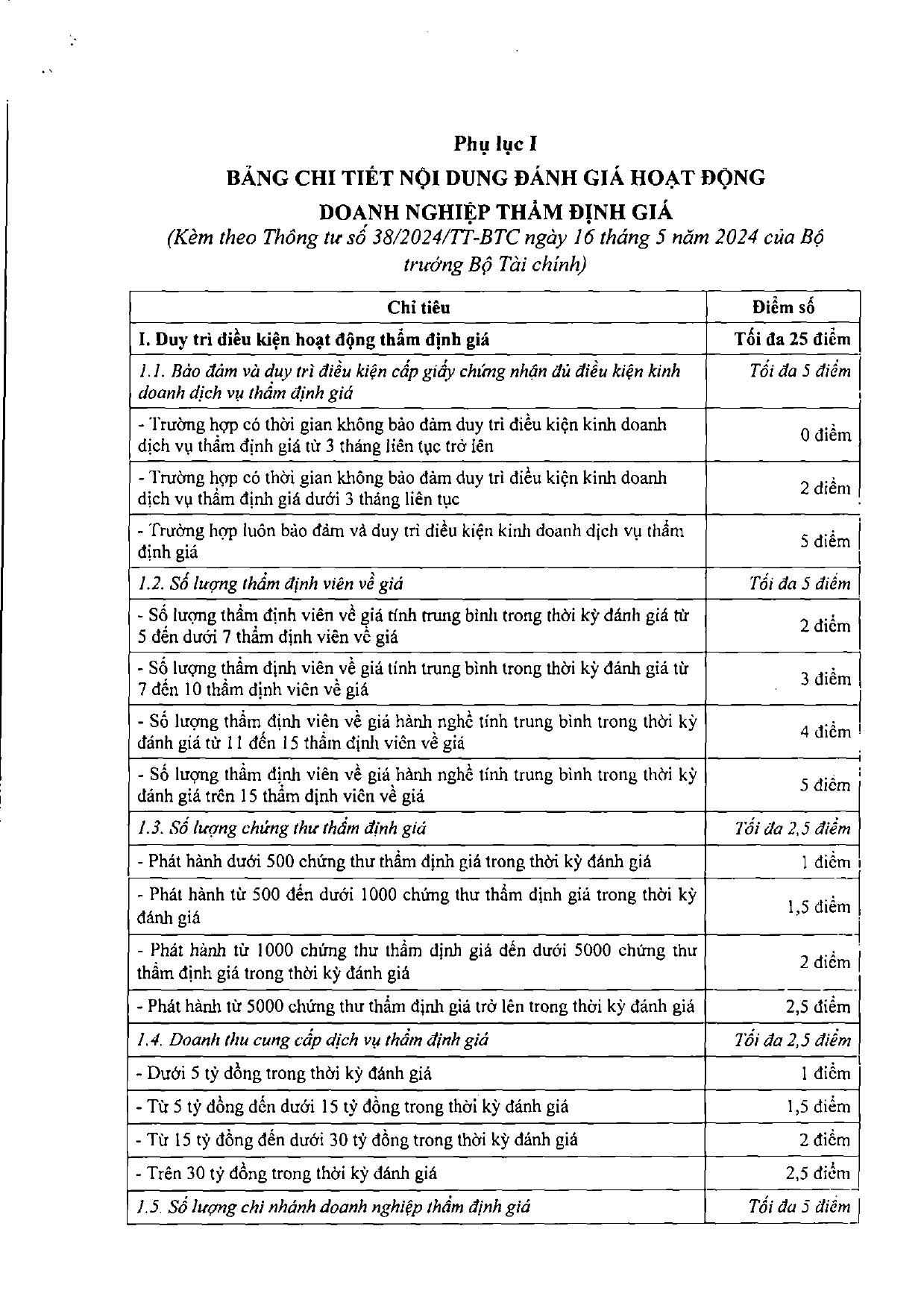 Ngày 16/05/2024, Bộ trưởng Bộ Tài chính ban hành Thông tư 38/2024/TT-BTC quy định về đánh giá hoạt động doanh nghiệp thẩm định giá; trích lập dự phòng rủi ro nghề nghiệp, chế độ báo cáo về hoạt động thẩm định giá của doanh nghiệp thẩm định giá và chi phí phục vụ cho việc thẩm định giá của hội đồng thẩm định giá.