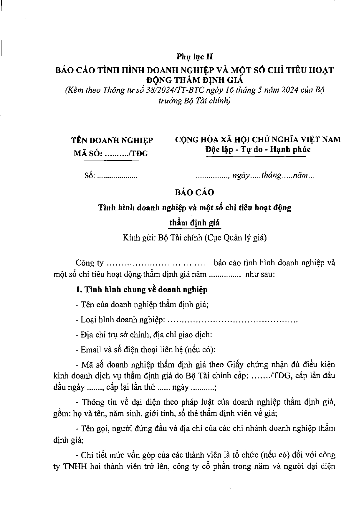 Thông tư 38/2024/TT-BTC quy định về đánh giá hoạt động doanh nghiệp thẩm định giá; trích lập dự phòng rủi ro nghề nghiệp, chế độ báo cáo về hoạt động thẩm định giá của doanh nghiệp thẩm định giá và chi phí phục vụ cho việc thẩm định giá của hội đồng thẩm định giá